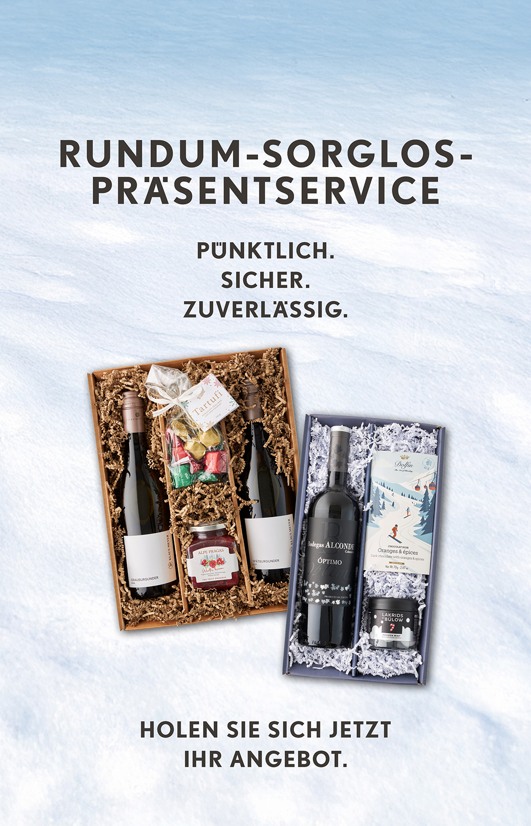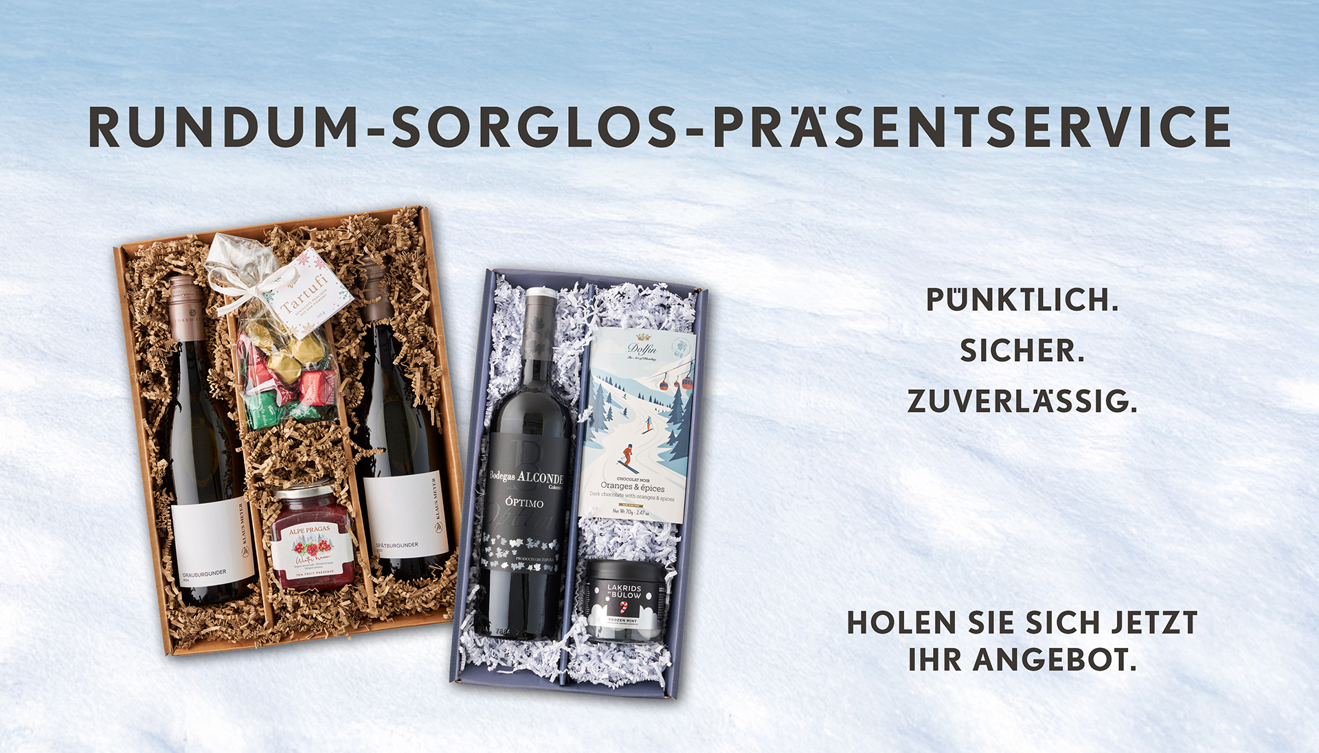Suchen Sie nach dem besonderen Präsent für Ihre Liebsten, Mitarbeiter oder Kunden? Unser Präsentekomplettservice bietet Ihnen eine stressfreie Lösung, um Genuss zu verschenken. Wählen Sie aus erlesenen Weinen, hochwertigen Spirituosen und Feinkost-Spezialitäten das ideale Geschenk für jeden Anlass.