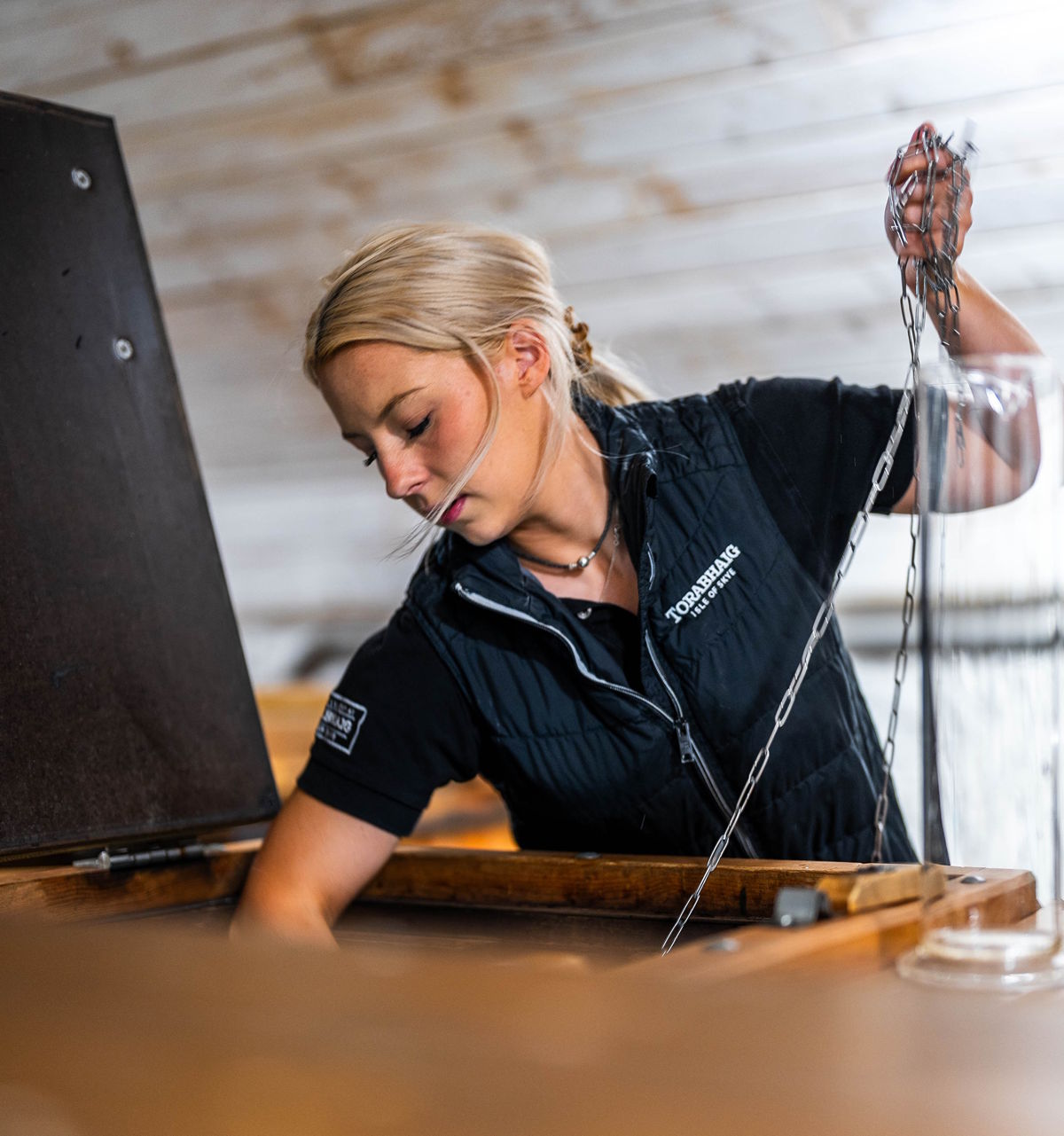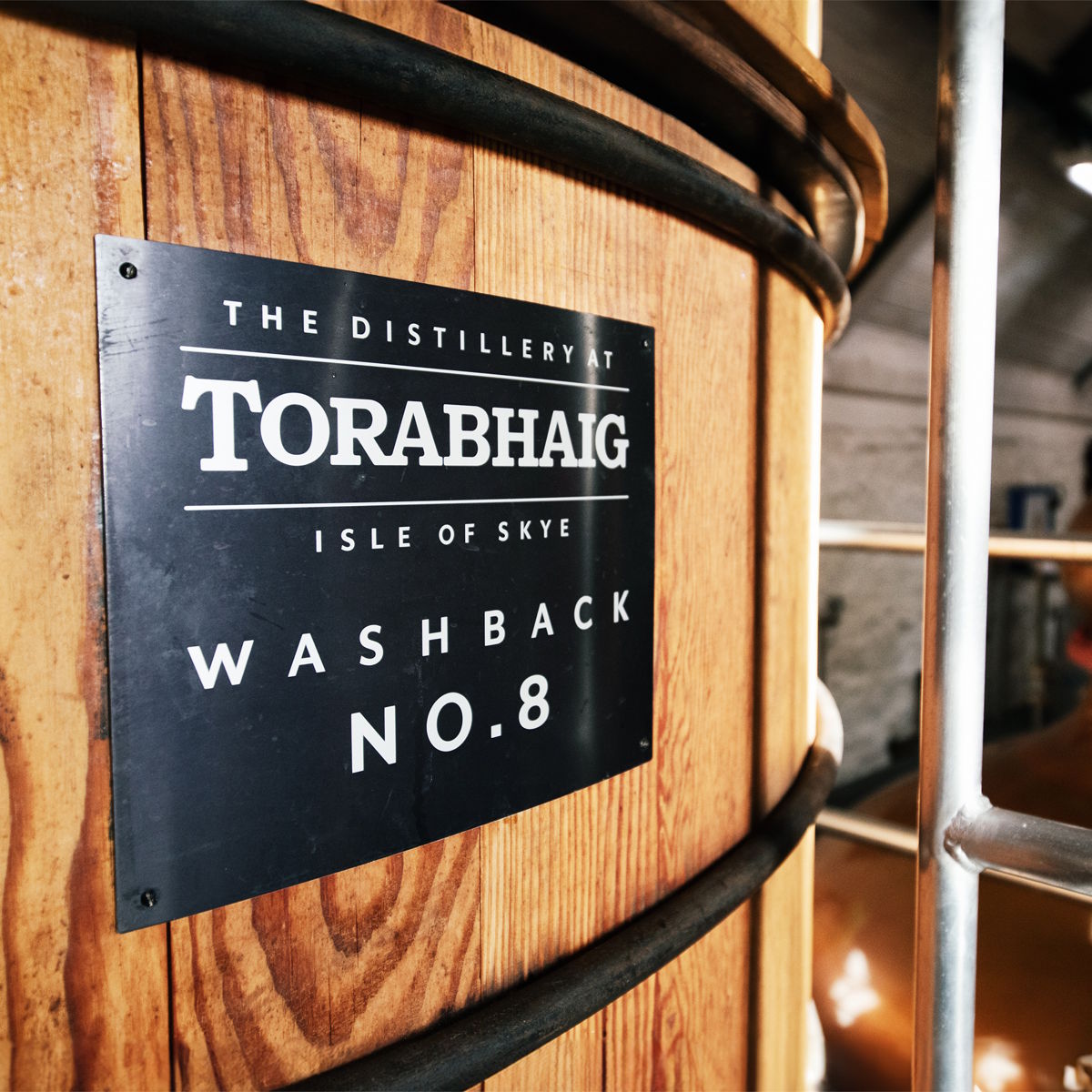 Torabhaig versteht sich bewusst als „klassische“ Malt Whisky Brennerei. Das Malz, mit einem Rauchgehalt von bis zu 75 ppm, wird in einer stählernen Mash Tun mit Kupferdeckel verarbeitet. Die acht hölzernen Washbacks aus Douglas-Fichte bieten Platz für Gärzeiten zwischen 80 und 120 Stunden – die Basis für aromatische Tiefe. Gebrannt wird auf zwei Kupferbrennblasen von Forsyths: einer Wash Still mit 8.000 Litern und einer Spirit Still mit 5.000 Litern.