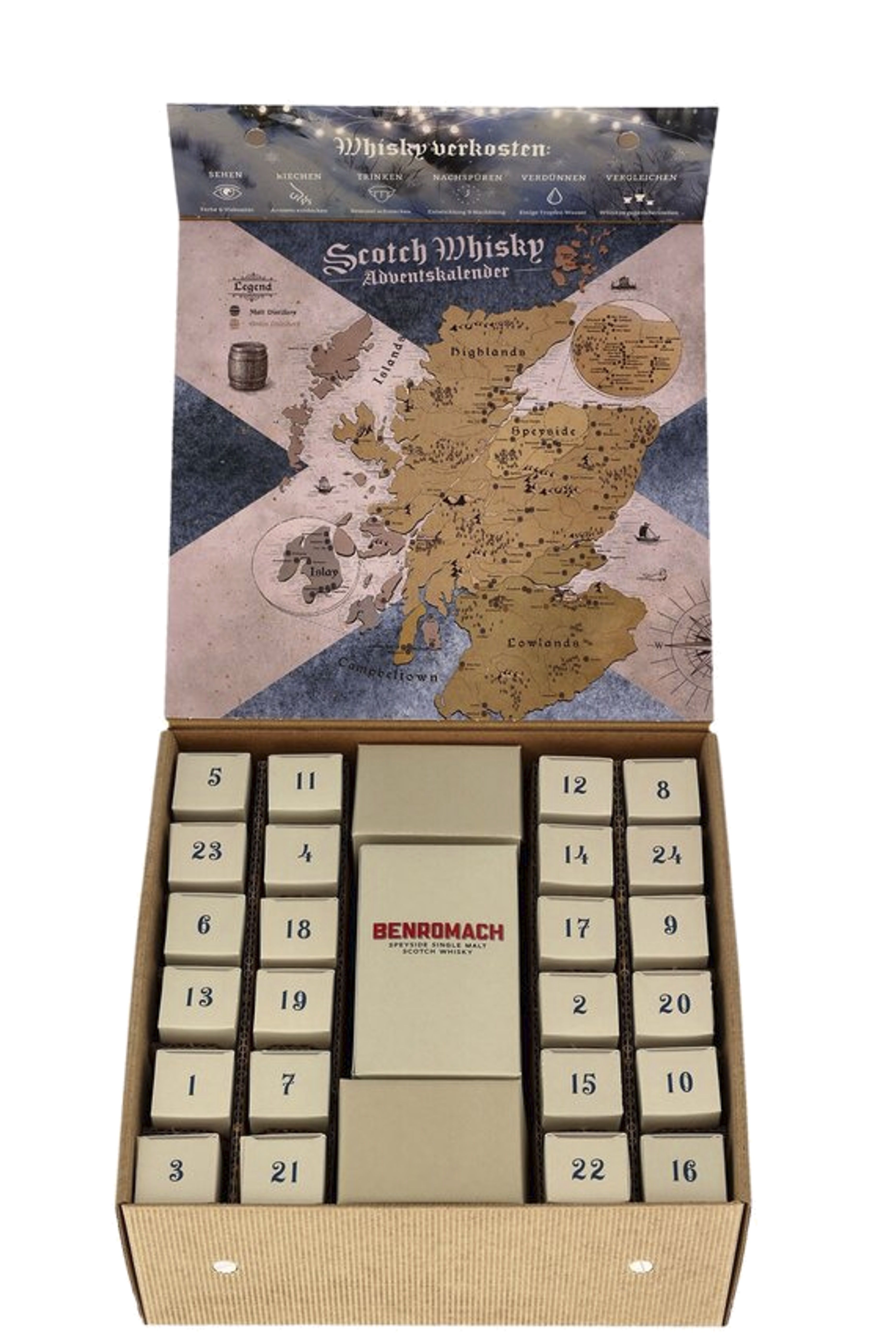 Das Set enthält 24 Miniaturen à 2cl und ein hochwertiges Nosingglas, ideal zum stilvollen Probieren in der Adventszeit. Verpackt in einem festlich blau-weißen Design – ein Muss für alle Whiskyfans.